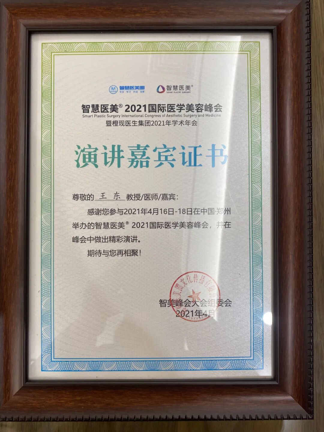 (王东院长荣获智慧医美官方颁发“演讲嘉宾证书”)
